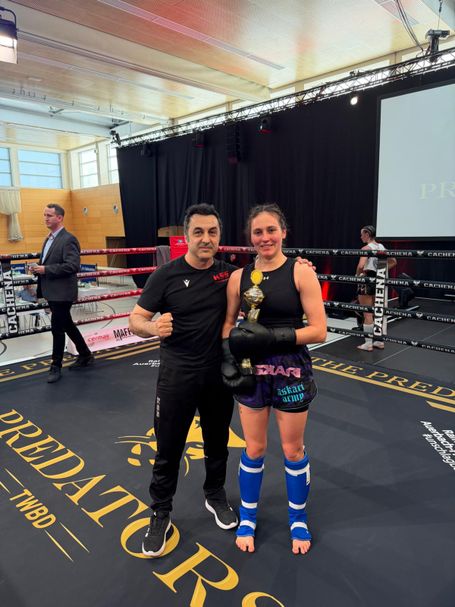 Am Samstag waren wir wieder mit zwei Kämpfern auf einer Fight Night vertreten. Bei der "Night of the Predators" kämpfen erfahrene Kampfsportler um den Europameister- und Weltmeistertitel (WKU). Unsere zwei Schüler Maria und Miraç konnten sich einen der Vorkämpfe sichern und durften in der großen Halle vor Publikum in den Ring steigen. Beide hatten Gegner, die es den beiden nicht leicht gemacht haben. Dennoch haben sie dagegengehalten und zwei super Kämpfe abgeliefert. Am Ende hat es bei Miraç leider nicht ganz für einen Sieg gereicht, dennoch sind er und Trainer Shahruz sehr zufrieden mit dem Kampf. Maria hatte etwas mehr Glück und konnte ihre Gegnerin am Ende besiegen. Sie durfte mit einem Pokal den Ring verlassen.