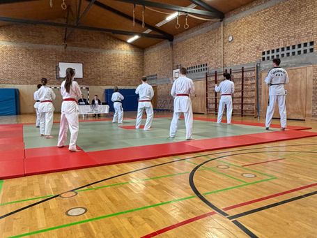 Neben zahlreichen Kindern hat sich auch unser Rotgurtträger Oli getraut den nächsten Schritt in Richtung schwarzen Gürtel zu machen. Außerdem wagten auch unsere Schüler Mark und Maya einen großen Schritt: die Prüfung auf den blauen Gürtel. Damit gehören sie nun offiziell auch zu den Fortgeschrittenen und müssen sich in Zukunft noch anspruchsvolleren Aufgaben stellen. Neben den üblichen Disziplinen wie Selbstverteidigung, Formenlauf und Einschritt-Kampf mussten die drei ebenfalls ihr Können im Wettkampf zeigen. Außerdem musste Oli zudem zwei verschiedene Techniken im Bruchtest vorzeigen.